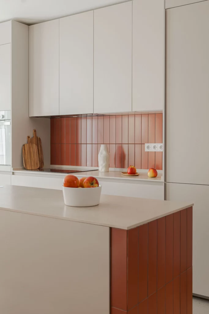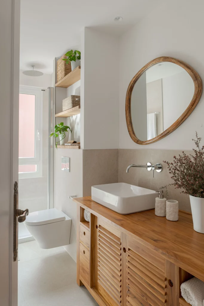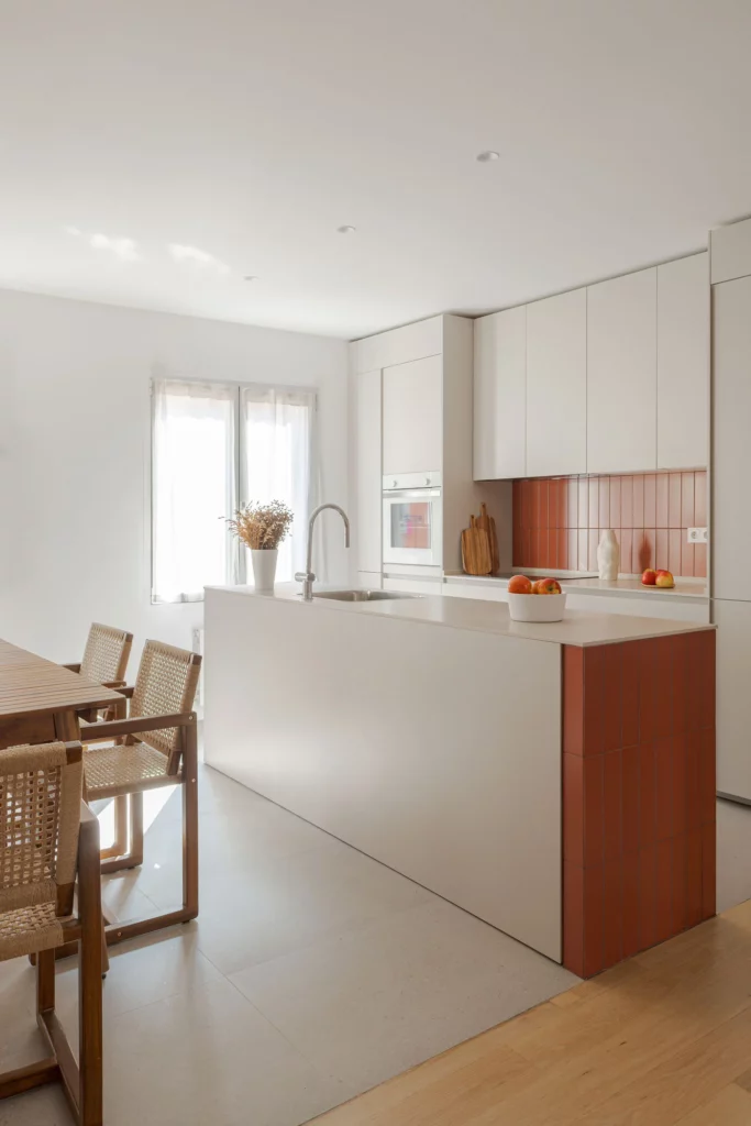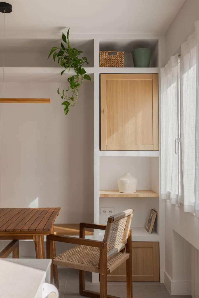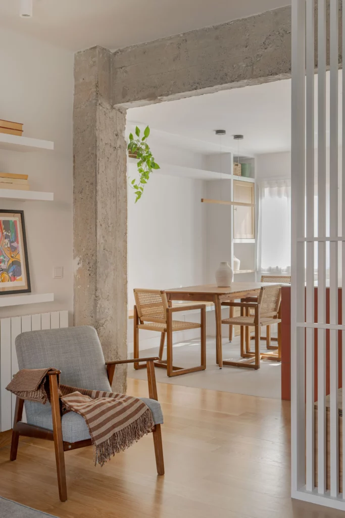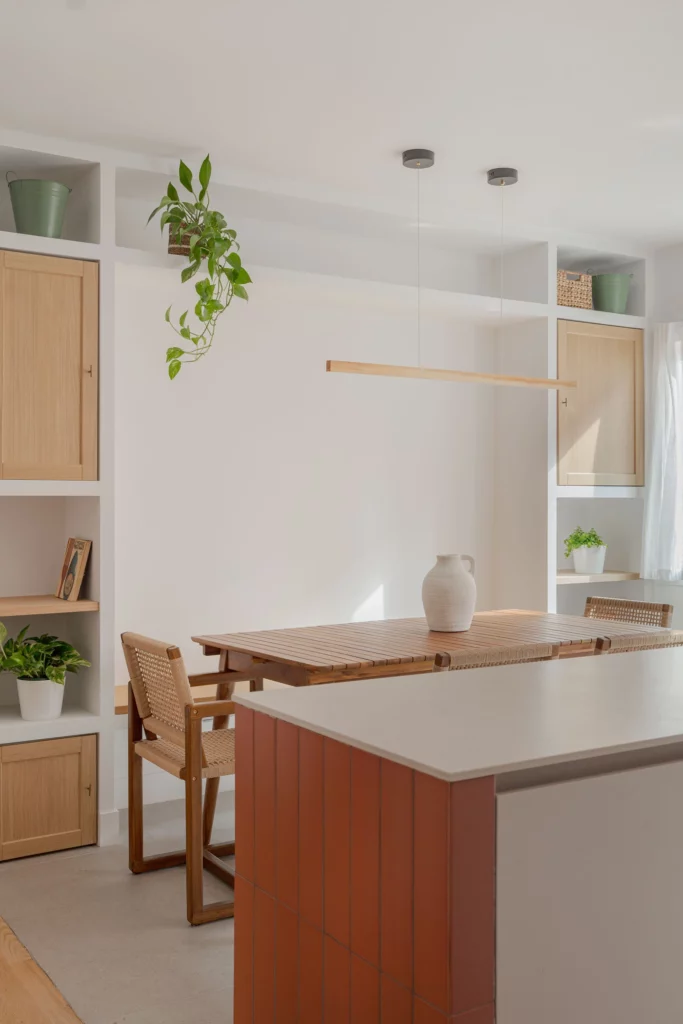 En esta vivienda tan compartimentada, la propuesta consigue crear un único espacio de salón-cocina-comedor y aunque cada uso tenga su espacio, la sensación de amplitud, luminosidad y calma nada tienen que ver con la de las estancias anteriores.