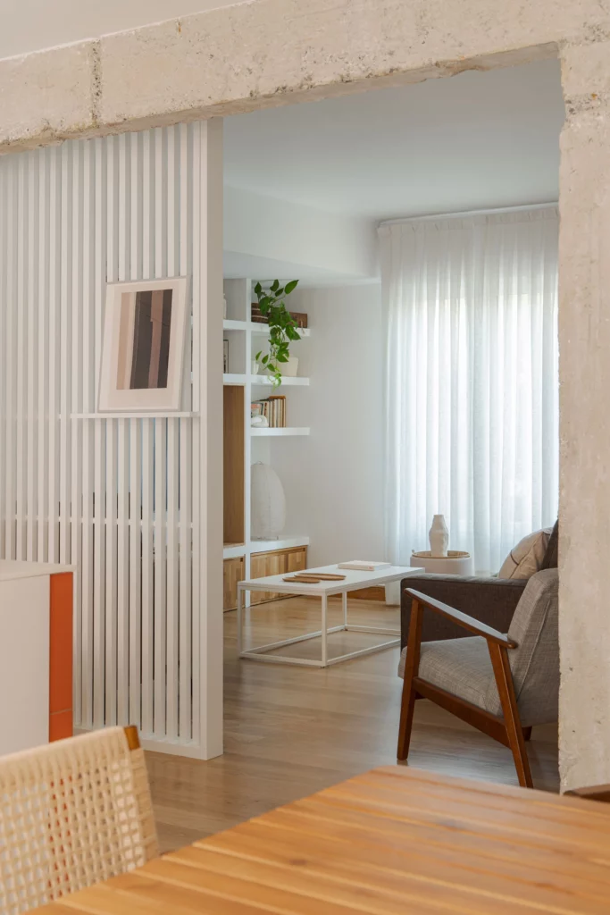 Mediante la celosía de madera de la entrada, generamos un espacio de llegada más recogido, que a su vez nos sirve para dar mayor privacidad e intimidad al salón.