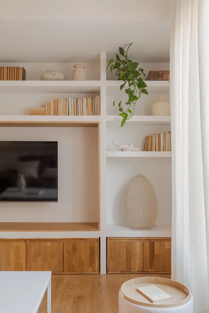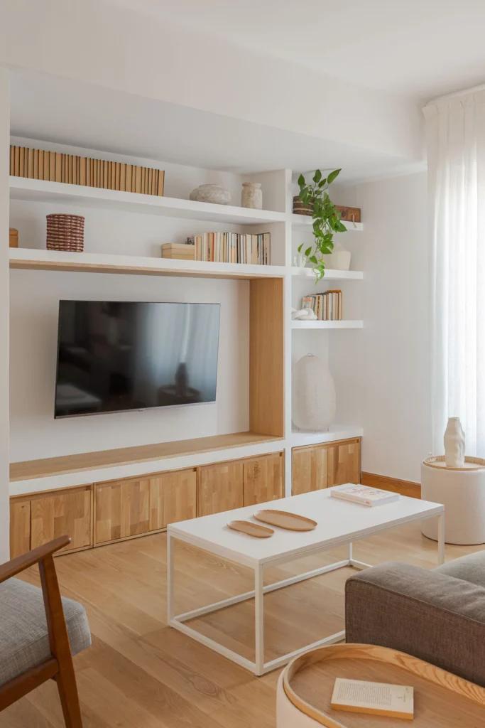 El mobiliario a medida del salón y el comedor optimizan el almacenamiento y orden de estos espacios y hace que aunque estén bastante separados, leamos las dos estancias dentro de un mismo marco.