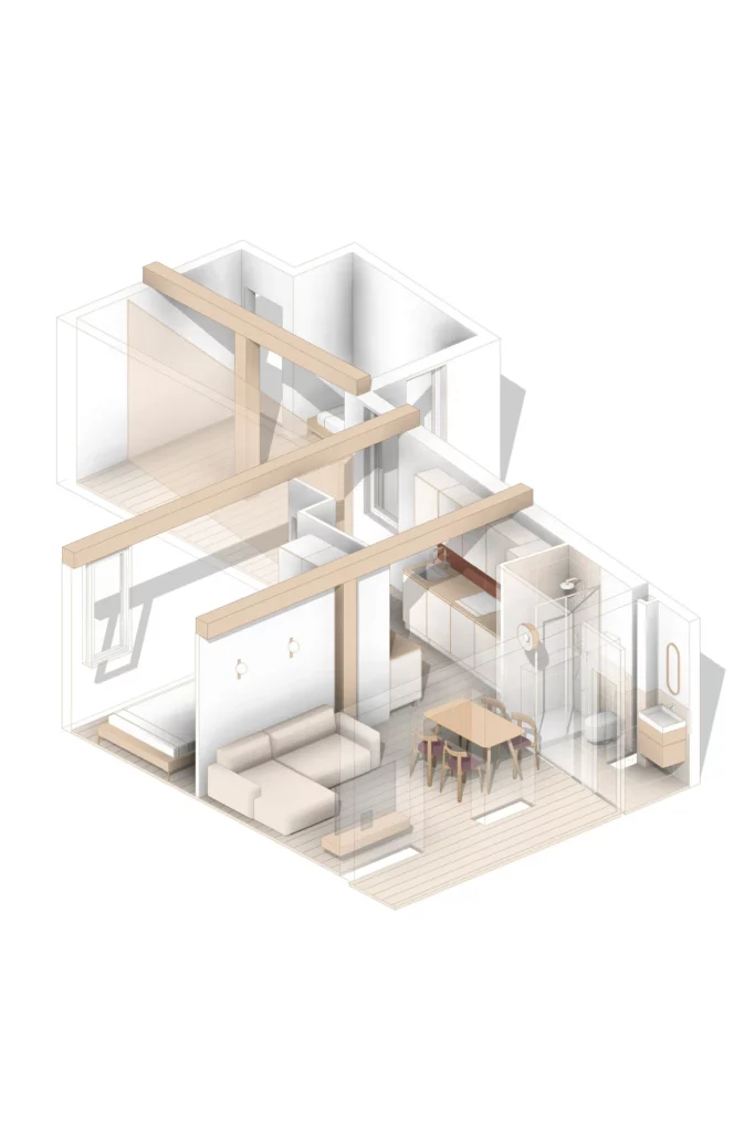 El reto de esta vivienda interior ha sido maximizar la iluminación natural. Aun partiendo de una geometría muy compleja en planta, una pequeña adecuación de los dormitorios y la reubicación del baño han permitido que el espacio de día se haya convertido en un espacio amplio y luminoso.